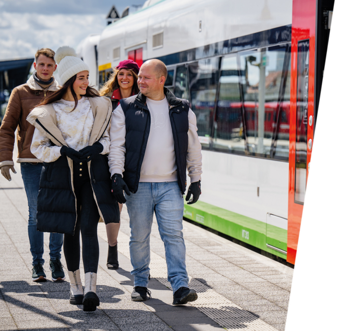 Auch Winterwanderungen lassen sich ideal mit dem Zug erreichen. Erleben Sie die Natur bei einem gemütlichen Spaziergang durch die Winterlandschaften oder einer längeren Winterwanderung rund um Jena oder Kahla. Wer die Routen vorher planen möchte, findet auf dem Komoot-Kanal der Erfurter Bahn detaillierte Karten mit Streckeninformationen, Einkehrmöglichkeiten und Hinweisen zu den Sehenswürdigkeiten entlang des Weges. Nutzen Sie für Ihre Reise die Tickets des VMT. Mit dem VMT-Hopper-Ticket oder der VMT-Gruppentageskarte sind Familien oder Gruppen in Zug, Bus und Straßenbahn flexibel und preisgünstig mit einem Ticket unterwegs. Einsteigen, losfahren und die winterliche Region entdecken — vom Weihnachtsmarktbesuch bis zur Winterwanderung ist alles direkt erreichbar.