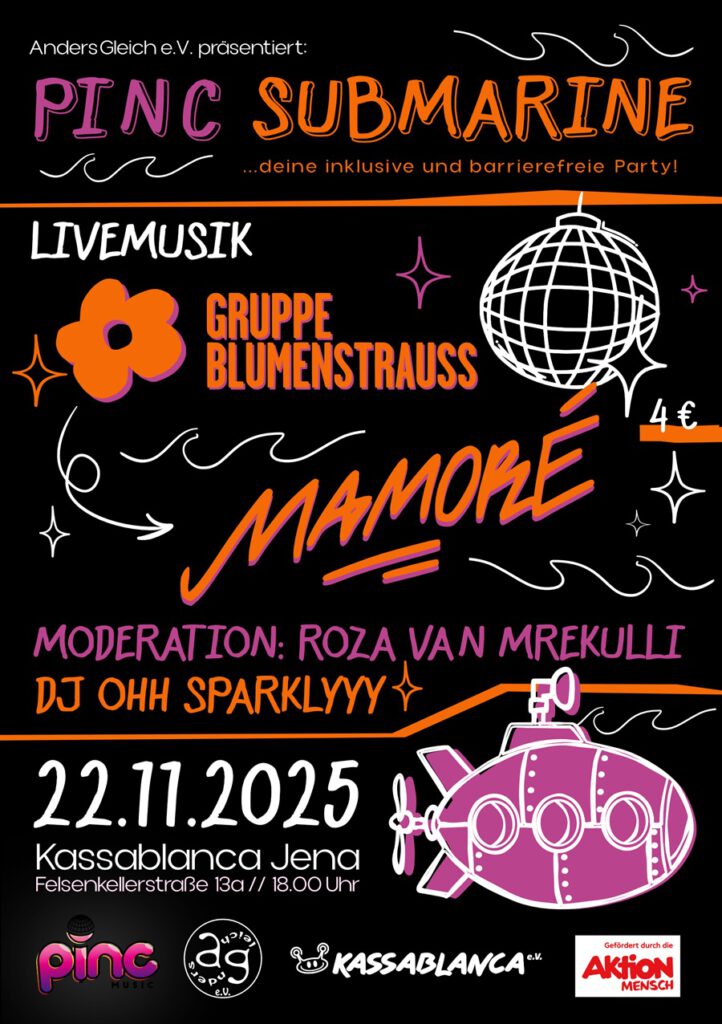 Pinc Submarine: Inklusive Party am 22. November 2025 um 18 Uhr im Kassablanca Jena, Felsenkellerstraße 13a. Tickets sowie weitere Informationen sind zu finden unter www.andersgleich.de sowie unter www.kassablanca.de! Sollte Bedarf an einer Assistenz für den Abend bestehen, dann meldet Euch unter 0179/7481481!