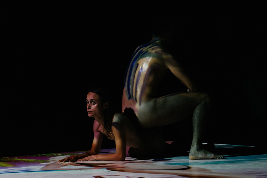 Die choreografische Atmosphäre Inter-Space beschäftigt sich mit dem Dazwischen. Eine aktive Materialisierung, eine Einladung, sich intersubjektiv mit allem zu verbinden, was war, ist und sein wird: Wenn wir dem Leben des Anderen Aufmerksamkeit schenken – kann das Andere dann auf geheimnisvolle Weise in uns selbst gegenwärtig werden? Kreative Physikalität und elektronische Klänge verschmelzen zu sich öffnenden Zwischenräumen. Das Publikum ist eingeladen, sich öffnende Zwischenräume zu betreten und – wenn nötig – seine Positionen und Perspektiven neu zu ordnen.