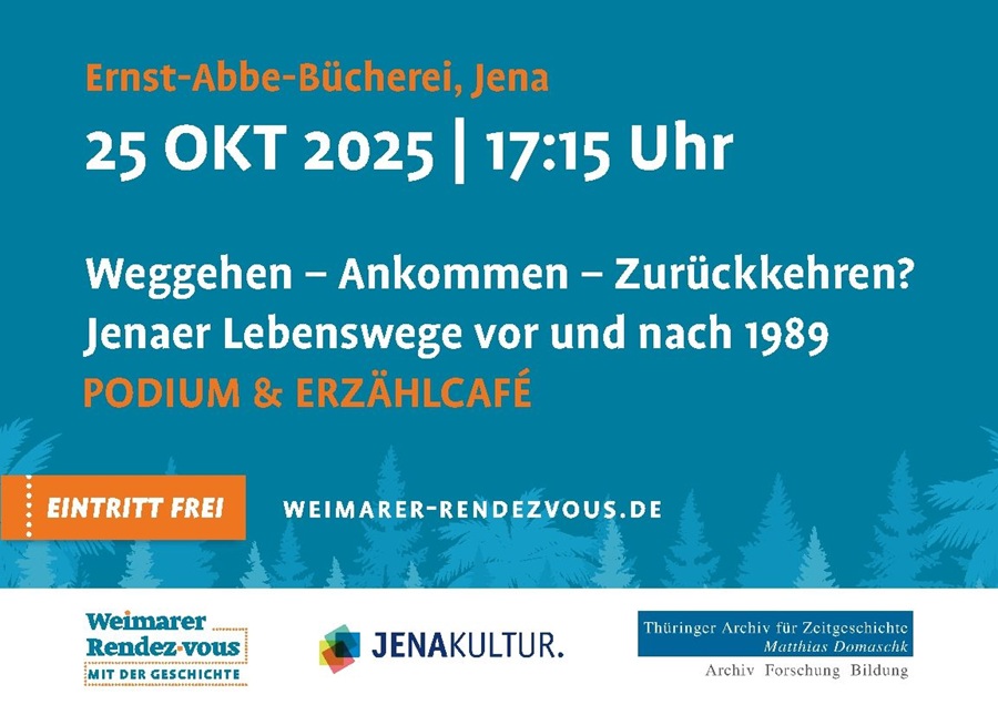 Jenaer Lebenswege vor und nach 1989: Podiumsdiskussion und Erzählcafé am 25. Oktober 2025 um 17.15 Uhr in der Ernst-Abbe-Bücherei Jena. Der Eintritt ist frei!