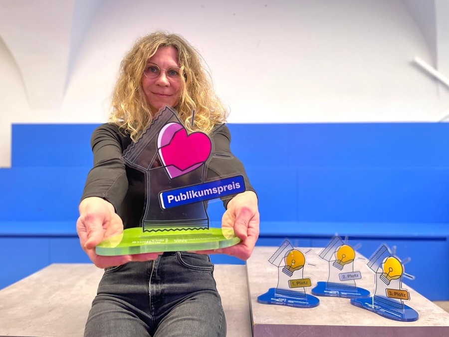 StadtLab-Projektmanagerin Grit Sachse präsentiert einen der Pokale für den StadtLab Ideenwettbewerb 2025.